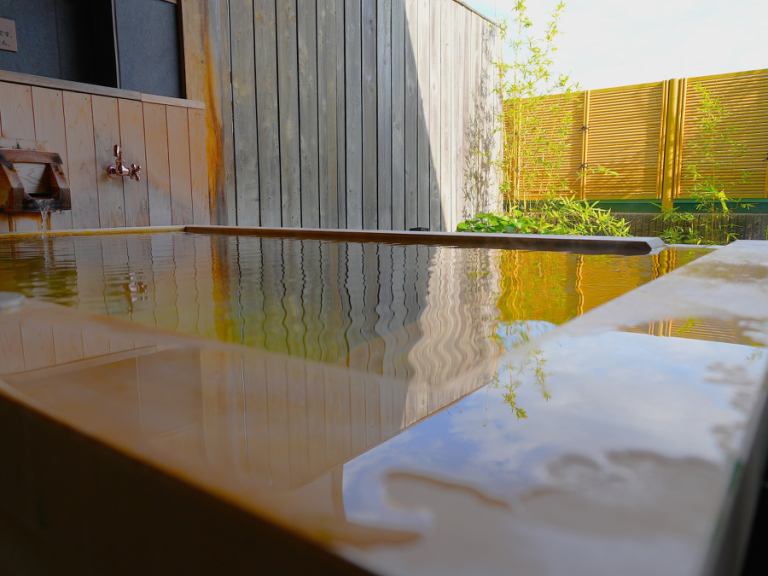 - 【柏木專用戶外浴池僅供客人使用】鹼性 pH 值 9.1 氯化鈉泉,源頭自由流淌